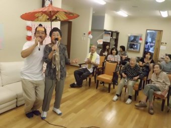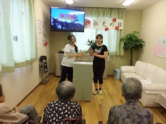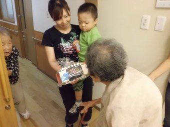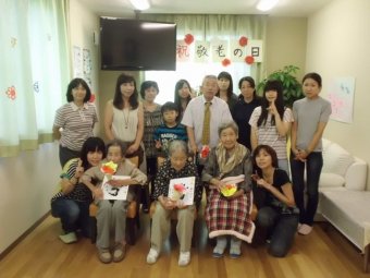 2012年09月17日(月) グループホーム「あんだんて」で、敬老会を行いました。 グループホーム「あんだんて」では、ご入居者の皆様の長寿をお祝いする、 敬老会を開催いたしました。 食事会、カラオケ大会を行いました。 そして、保育所園児や職員の手作りのプレゼントを貰っていただきました。