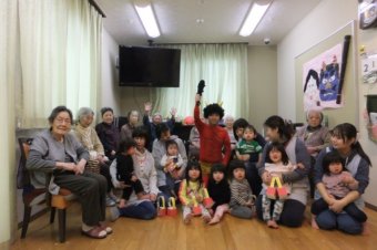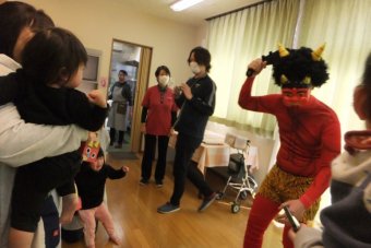 〝あんだんて〟のおばあちゃん達と一緒に豆まきをしました。 鬼の登場に泣いてしまうお友だちもいたけど、最後には一緒に写真も撮りました。