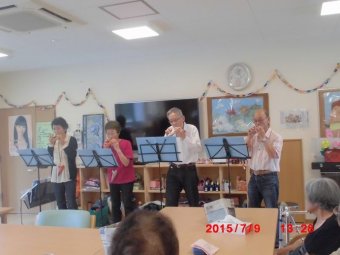 2015年07月22日(水) デイサービス「こうづの笑み」で、オカリナを演奏して頂きました。 デイサービス「こうづの笑み」で、ボランティアに皆さんによるオカリナ演奏会を行って頂きました。 昼食の後に、利用者さんも職員もすばらしいオカリナの響きに癒させてもらいました。