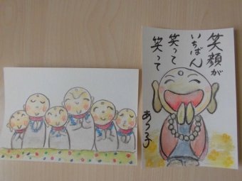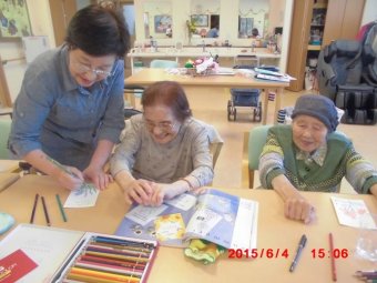 2015年06月04日(木) デイサービス「こうづの笑み」で、手づくり絵はがきを作ってみました。 デイサービス「こうづの笑み」では、ボランティアの先生にお越し頂き、利用者さまと職員が手づくりの絵はがき作りに挑戦してみました。 先生のアドバイスを頂き、皆さん中々と上出来な絵はがきが出来ました。