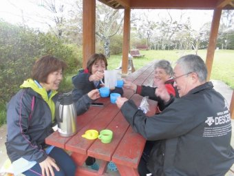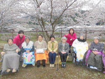 2015年04月07日(火) デイサービス「こうづの笑み」で、お花見に行ってきました。 デイサービス「こうづの笑み」では、4月7日8日の2班に分かれて、施設近くで勝地区のグランドゴルフ場にお花見に行ってきました。 お天気はいまいちでしたが、満開の桜でお花見ができて皆さん大喜びでした。