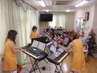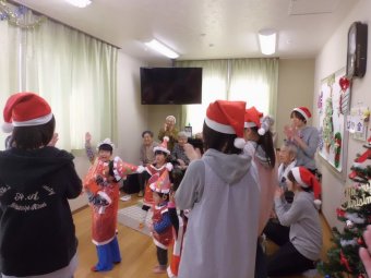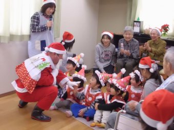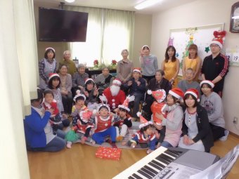 2014年12月19日(金) グループホーム『あんだんて』、保育所『ポコ・ア・ポコ』にて、クリスマス会を開催しました。 保育園児と入居者さんが、合同でクリスマス会を開催しました。キーボードの演奏や、サンタクロースにみんながプレゼントを頂いてクリスマス会を楽しみました。