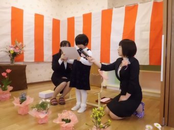 2014年03月28日(金) 保育所「ポコ・ア・ポコ」で、卒園式を行いました。 保育所「ポコ・ア・ポコ」で、卒園式を行いました。 グループホームの入居者様達もお祝いに駆けつけてくれました。 当事業所内保育所としては、初めての卒園式となりました。 保育士全員でアイデアを出し合い、すばらしい門出を祝う卒園式を挙行させて頂きました。