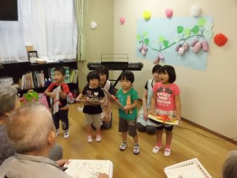 2013年09月15日(日) グループホーム「あんだんて」で、敬老会を開催しました。 9月16日の敬老の日に向けて、敬老会を行いました。 併設する保育所「ポコ・ア・ポコ」の園児達も合流し、演技や肩たたきをさせて頂き、プレゼントも贈らせてもらいました。お昼には、スタッフ手作りのお弁当を美味しく頂き、楽しい1日となりました。 来年も、皆様方と一緒にお祝いをしましょう。皆さん、お元気で!