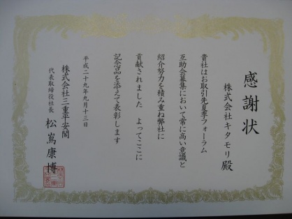 2017年09月13日(水) 取引先様より、感謝状いただきました。 2017年9月13日 取引先様より、感謝状いただきました。 取引先様の株式会社三重平安閣 夏季フォーラムにて 互助会募集に伴う表彰を頂きました。