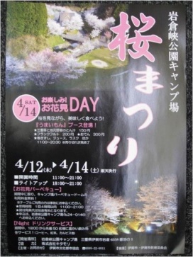 2012年04月14日(土) 名張桜まつり、岩倉峡公園キャンプ場桜まつり 名張桜まつり、岩倉峡公園キャンプ場桜まつりの2会場で、出店致しました。 フランクフルト、とん汁、おでん、巻きずし、ジュース、ラスク、割れせんなどを販売させて頂きました。 名張桜まつり 岩倉峡公園キャンプ場桜まつり