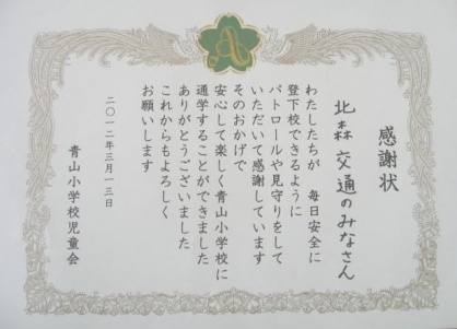 伊賀市立青山小学校児童会様より感謝状を頂きました。