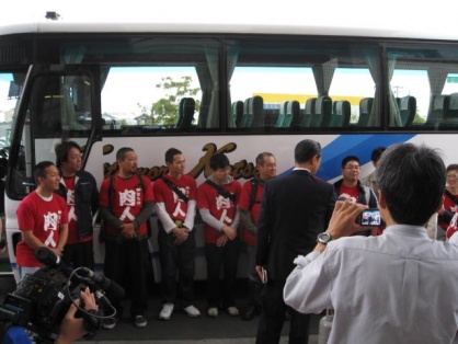2011年05月17日(火) 宮城県塩竈市へ炊き出しに出発致しました。 宮城県塩竈市へ炊き出しに出発致しました。 隠(なばり)牛汁協会、名張商工会議所青年部、名張市観光協会が宮城県塩竈市で炊き出しを行うための、出発式が名張市役所で行われました。観光バス1台と乗務員2名体制で輸送のお手伝いを、そして別の職員1名が塩竈市内の桂島、野々島の2つの離島など3カ所で17日に到着し準備出来次第、炊き出しをお手伝い致します。 5月17日の塩竈市での炊き出しの様子。
