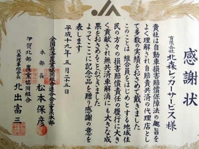 全国共済農業共済組合連合会様より、弊社の自賠責保険への取り組みに対して感 謝状をいただきました。