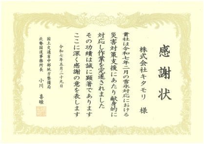 2025年5月29日、同年2月の名阪国道雪氷に伴う災害対策支援、功績が認められ感謝状を頂きました。